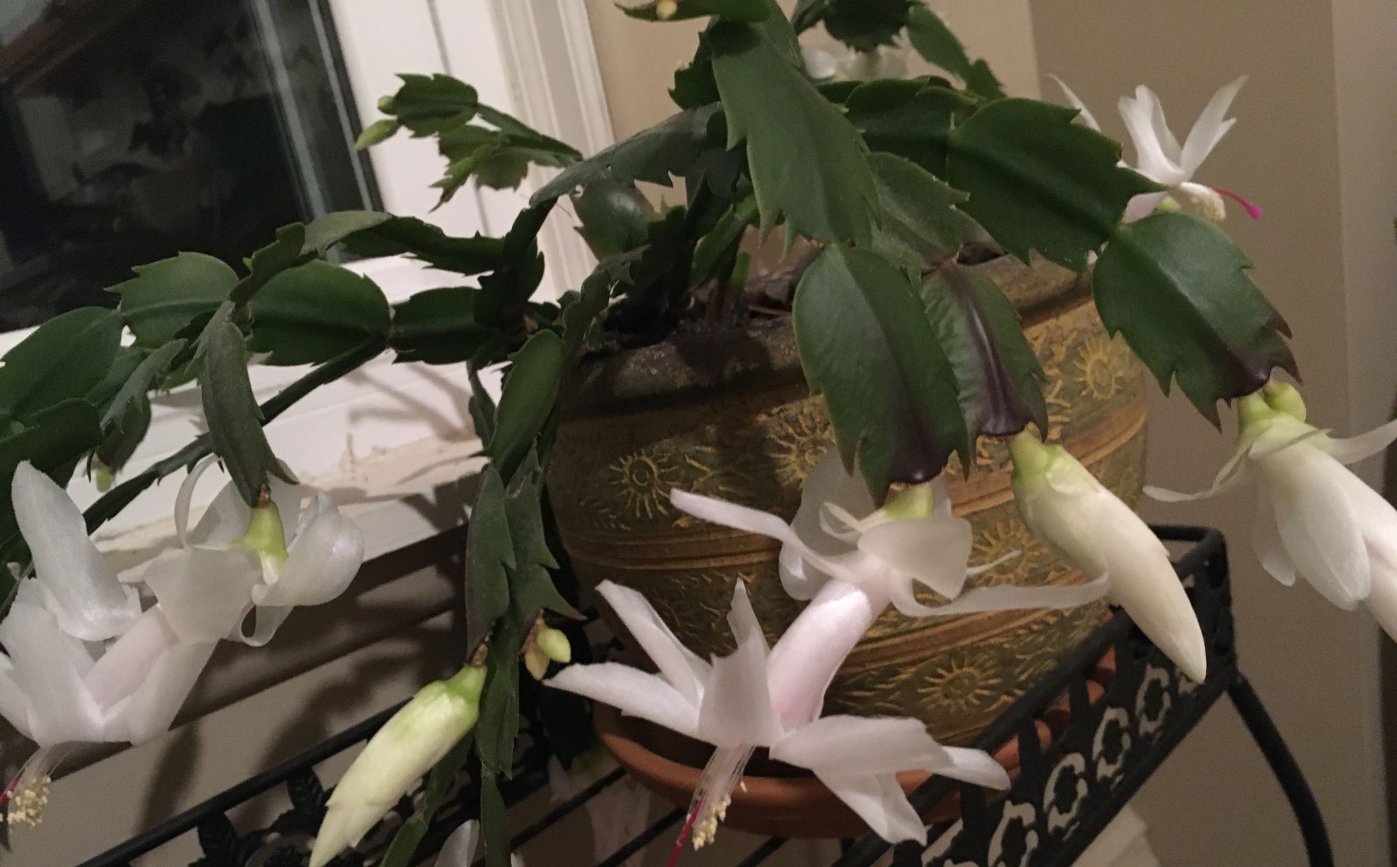 My amaryllis that was supposed to bloom at Christmas bloomed during Holy Week and kept blooming — four magnificent blooms and then a second stalk.  My fish scale tropical plant is supposed to bloom in southern climates when it is outside.  Mine is in my office and just finished offering one flower after another.  And now here is my Christmas cactus showing off its snow-colored offerings.