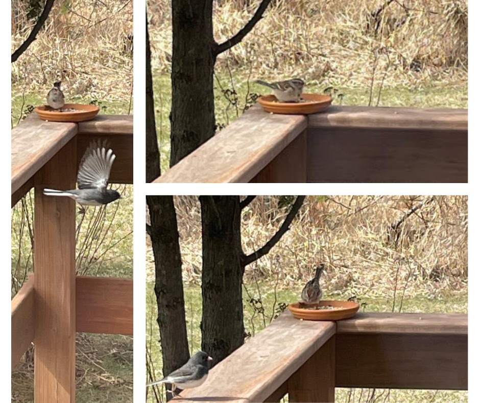 It’s not a good time to put bird (bear) feeders out, but I’ve been enchanted by the small songbirds that have been serenading my mornings, and which are particularly active in my backyard in the later afternoons. So on the deck railing I’ve put out a small terracotta plate with bird seed, to welcome them back and encourage their song. How I love their cheerful twirping and playful swooping in the cedars. Spring! Hope and new life and happy energy!